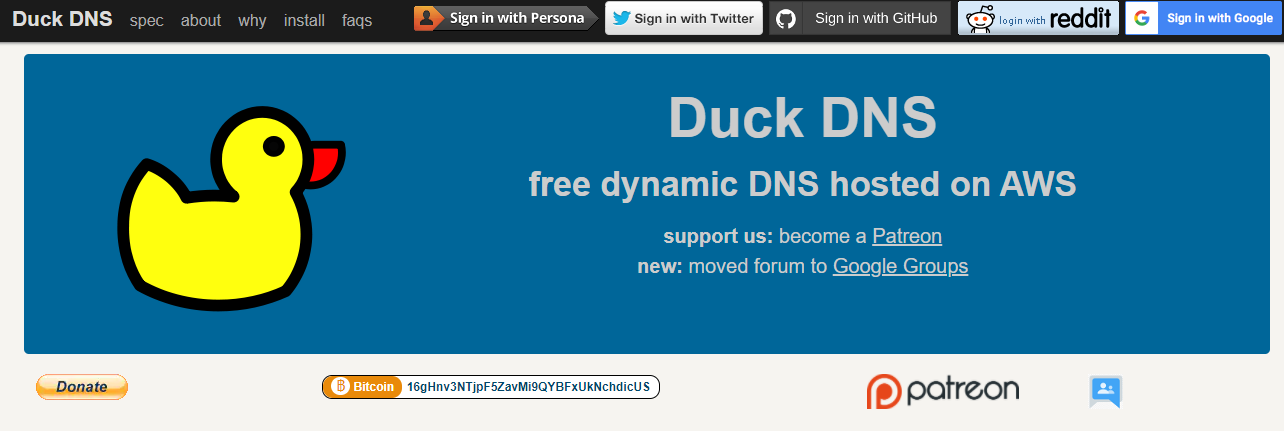 Duck DNS free dynamic DNS hosted on AWS support us: become a Patreon new: moved forum to Google Groups